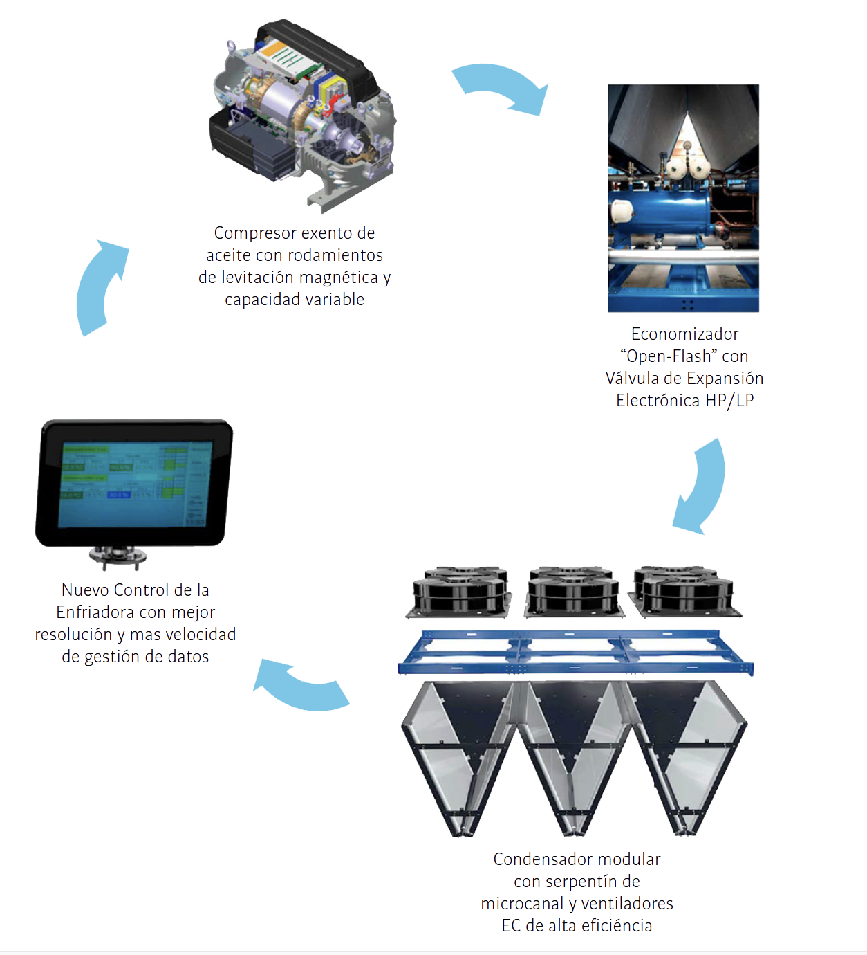 - • Compresor exento de aceite con rodamientos de levitación magnética y capacidad variable